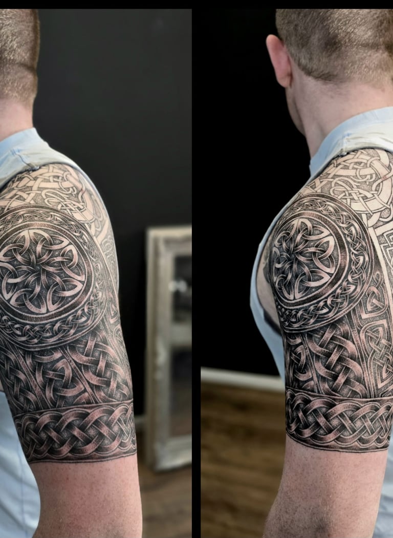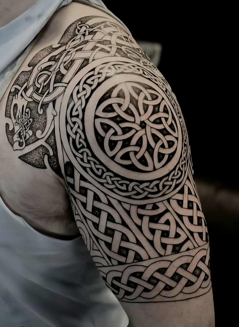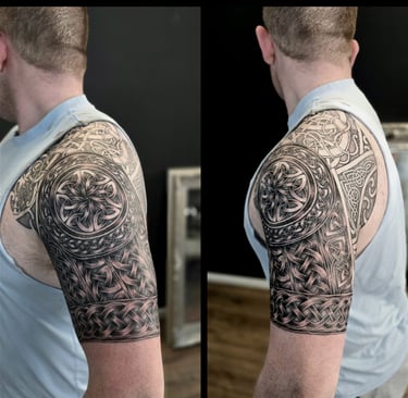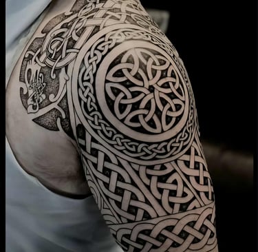 Celtic and Nordic tattoos draw inspiration from ancient symbols, knotwork, and mythology. Featuring intricate patterns, runes, and designs like dragons or wolves, they often represent strength, protection, and heritage. Their interwoven lines and symbolic imagery create powerful, timeless tattoos that honor ancestral roots while expressing spiritual connection and cultural identity.
