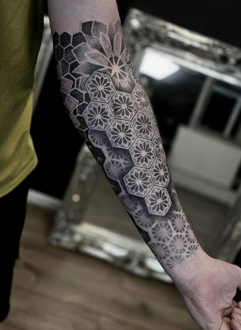 Geometric tattoos focus on symmetry, balance, and clean shapes such as triangles, circles, and polygons. Often inspired by mathematics, nature, and sacred geometry, they create visually striking patterns or structured versions of animals and symbols. This style blends precision with meaning, representing harmony, order, and interconnectedness in powerful body art.