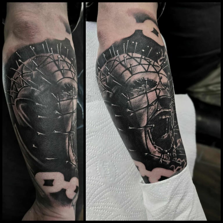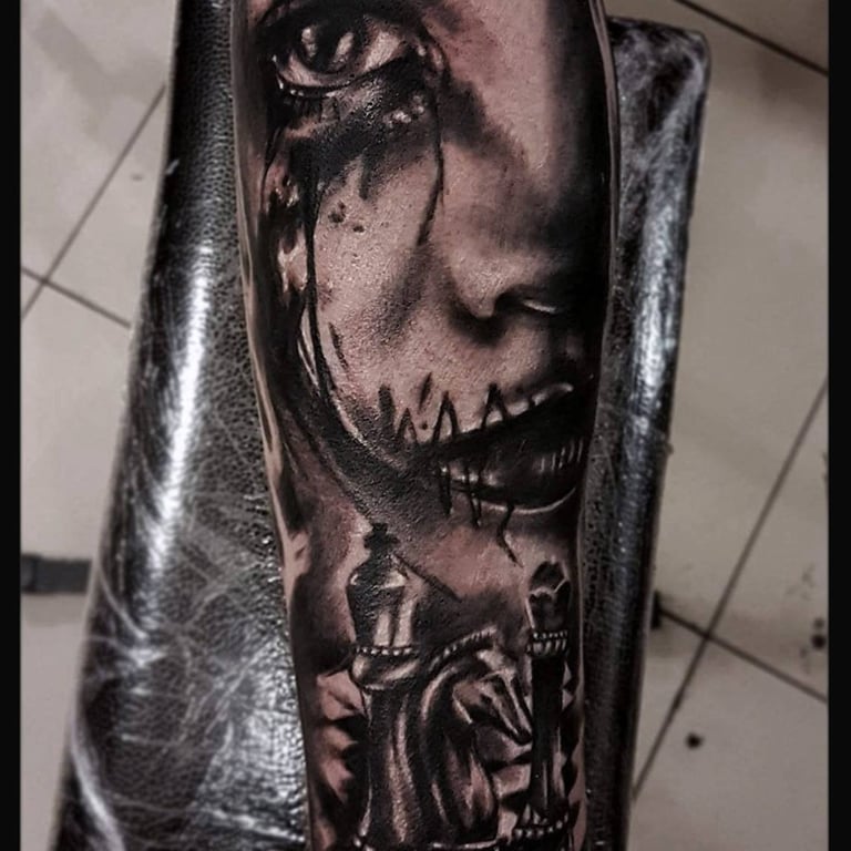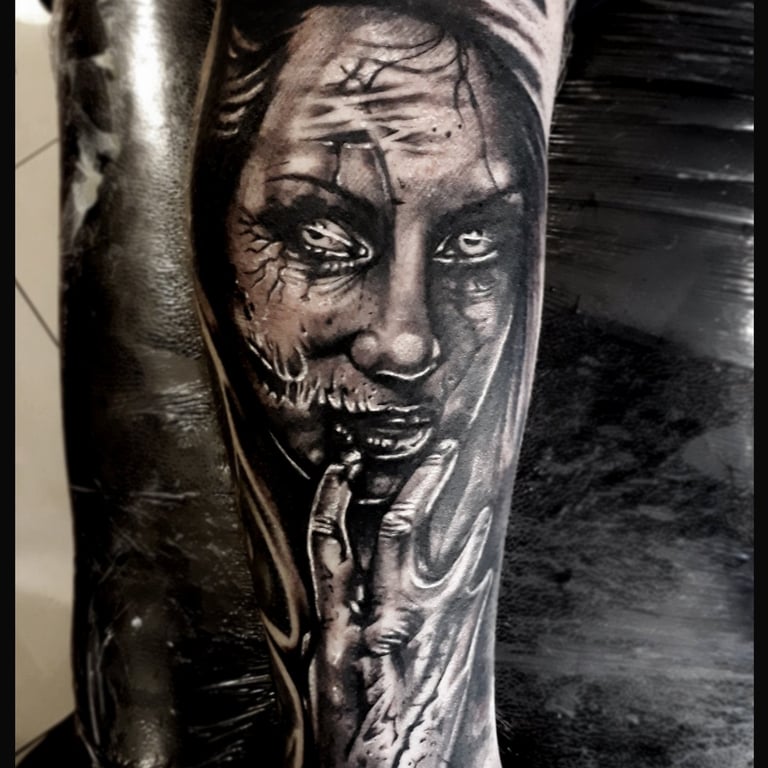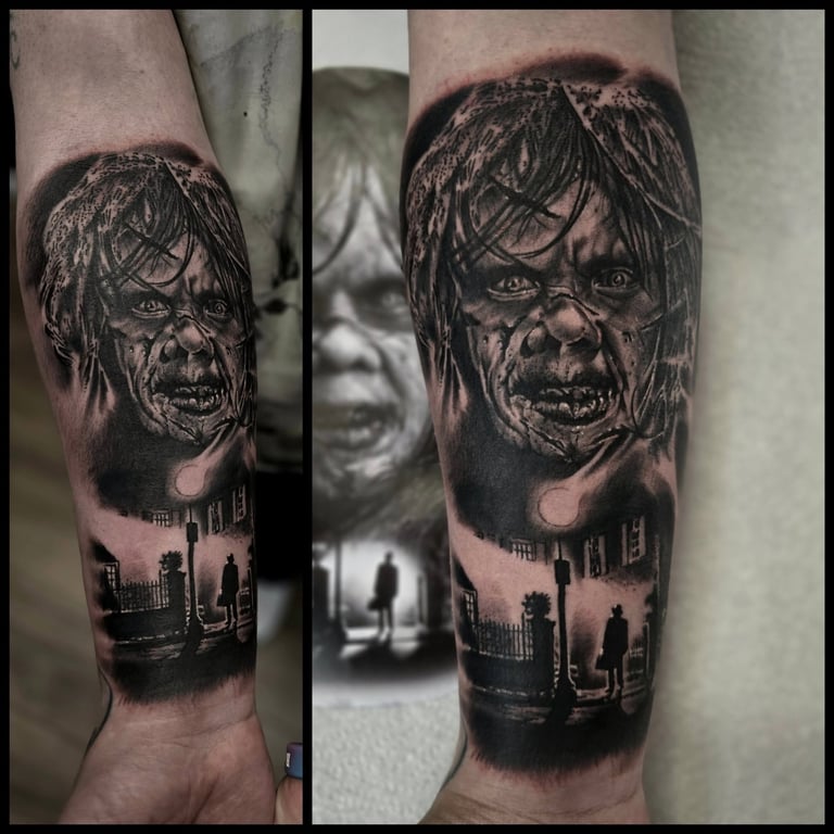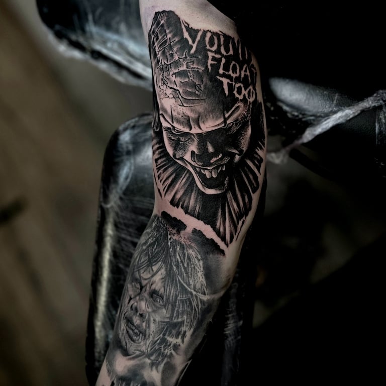 Horror-themed tattoos draw inspiration from dark, eerie, and macabre imagery, including monsters, skulls, ghosts, and haunted scenes. They evoke fear, mystery, or fascination with the supernatural. Often detailed and dramatic, these tattoos blend realism, black and grey, or illustrative styles, allowing wearers to express their love for horror and the unknown.