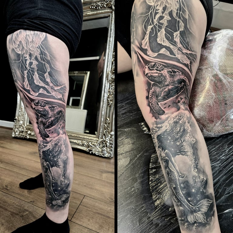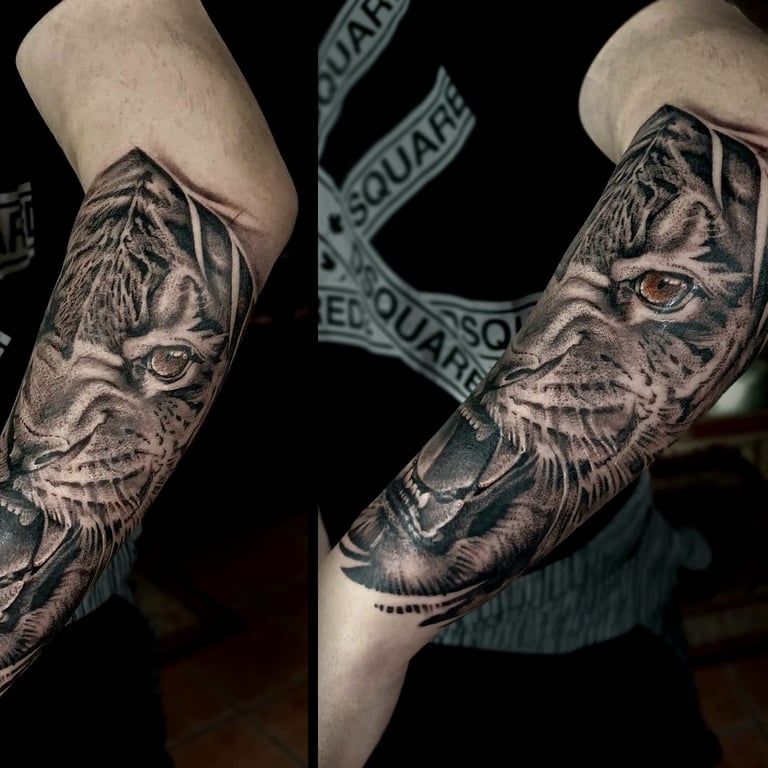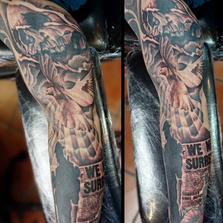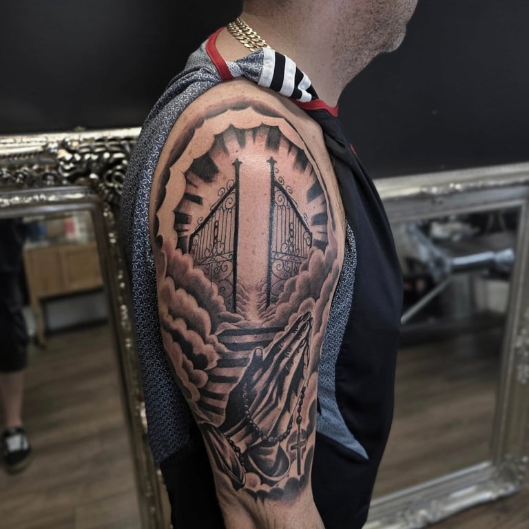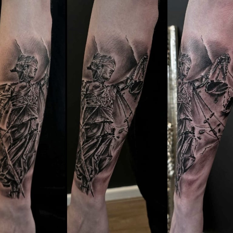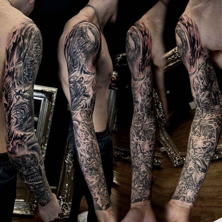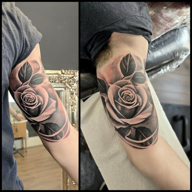 Black and grey tattoos use contrast, shading, and soft gradients to create timeless, expressive artwork. Without relying on color, artists emphasize depth, form, and texture, making this style ideal for portraits, animals, florals, religious imagery, landscapes, and dramatic illustrative scenes. Smooth transitions between light and dark add realism, while bold blacks provide structure and impact. This approach is known for aging gracefully, often maintaining clarity over time. Black and grey tattoos can be bold or subtle, detailed or minimal, allowing artists to shape mood, emotion, and storytelling through carefully layered tones and refined shading techniques.