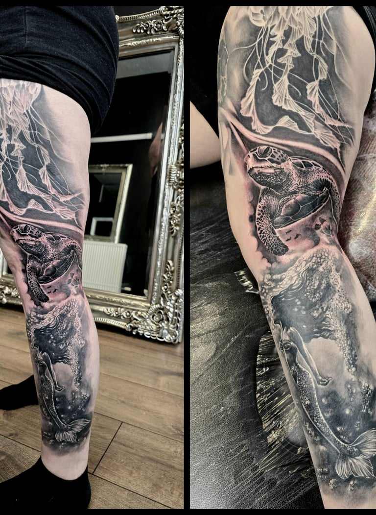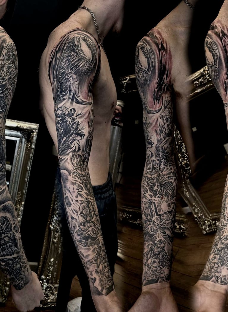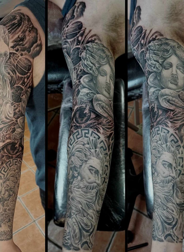 Themed tattoos revolve around a specific concept, story, or interest, such as mythology, travel, music, or nature. By focusing on a central idea, these tattoos create cohesive visual narratives, blending symbols, imagery, and styles. They allow personal expression, turning passions and meaningful stories into artistic, wearable representations.