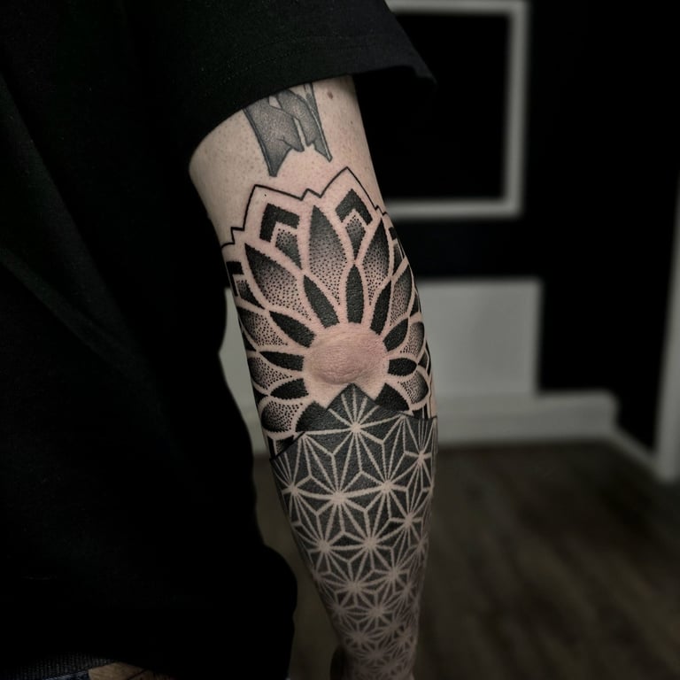 Geometric tattoos focus on symmetry, balance, and clean shapes such as triangles, circles, and polygons. Often inspired by mathematics, nature, and sacred geometry, they create visually striking patterns or structured versions of animals and symbols. This style blends precision with meaning, representing harmony, order, and interconnectedness in powerful body art.