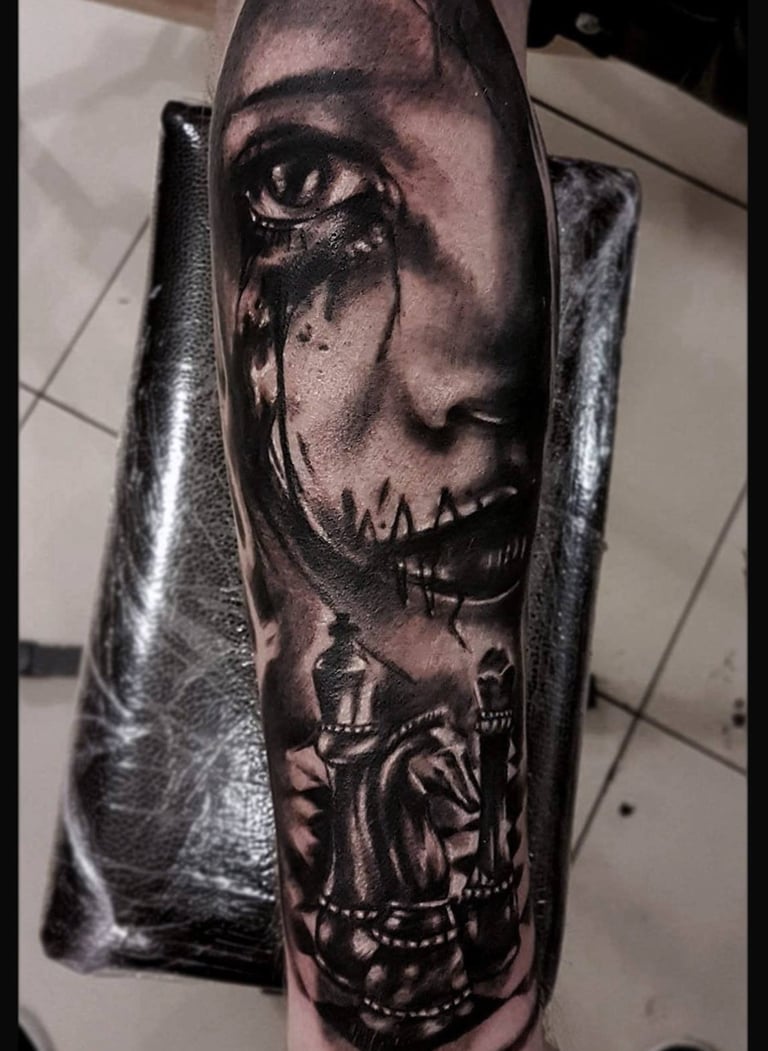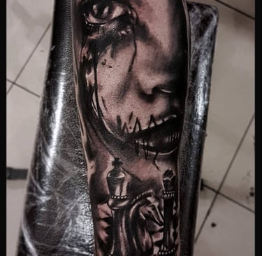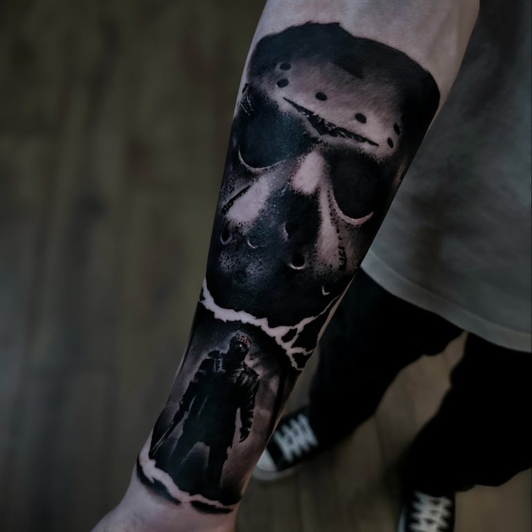 Horror-themed tattoos draw inspiration from dark, eerie, and macabre imagery, including monsters, skulls, ghosts, and haunted scenes. They evoke fear, mystery, or fascination with the supernatural. Often detailed and dramatic, these tattoos blend realism, black and grey, or illustrative styles, allowing wearers to express their love for horror and the unknown.