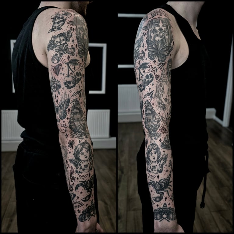 Patchwork tattoos create a vibrant, collage-like aesthetic by combining multiple standalone designs into one cohesive body canvas. Each piece maintains its individuality, allowing personal stories, interests, and styles to coexist without strict thematic rules. This approach celebrates spontaneity, mixing traditional, neo-traditional, minimalist, and illustrative motifs side by side. Patchwork layouts often evolve gradually, offering flexibility to add new symbols over time without worrying about symmetry or uniformity. The result is a dynamic, ever-growing mosaic that feels authentic, expressive, and intentionally eclectic. Patchwork tattoos invite freedom, encouraging wearers to curate meaningful art while embracing contrast, diversity, and visual rhythm and texture.